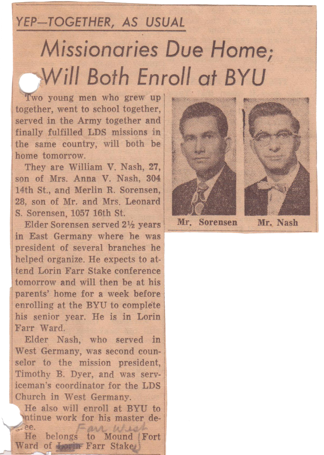 Later Bill Nash was in the Army and went on splits with full-time missionaries. He was so excited about his experiences that it was influential in my feelings for the gospel.