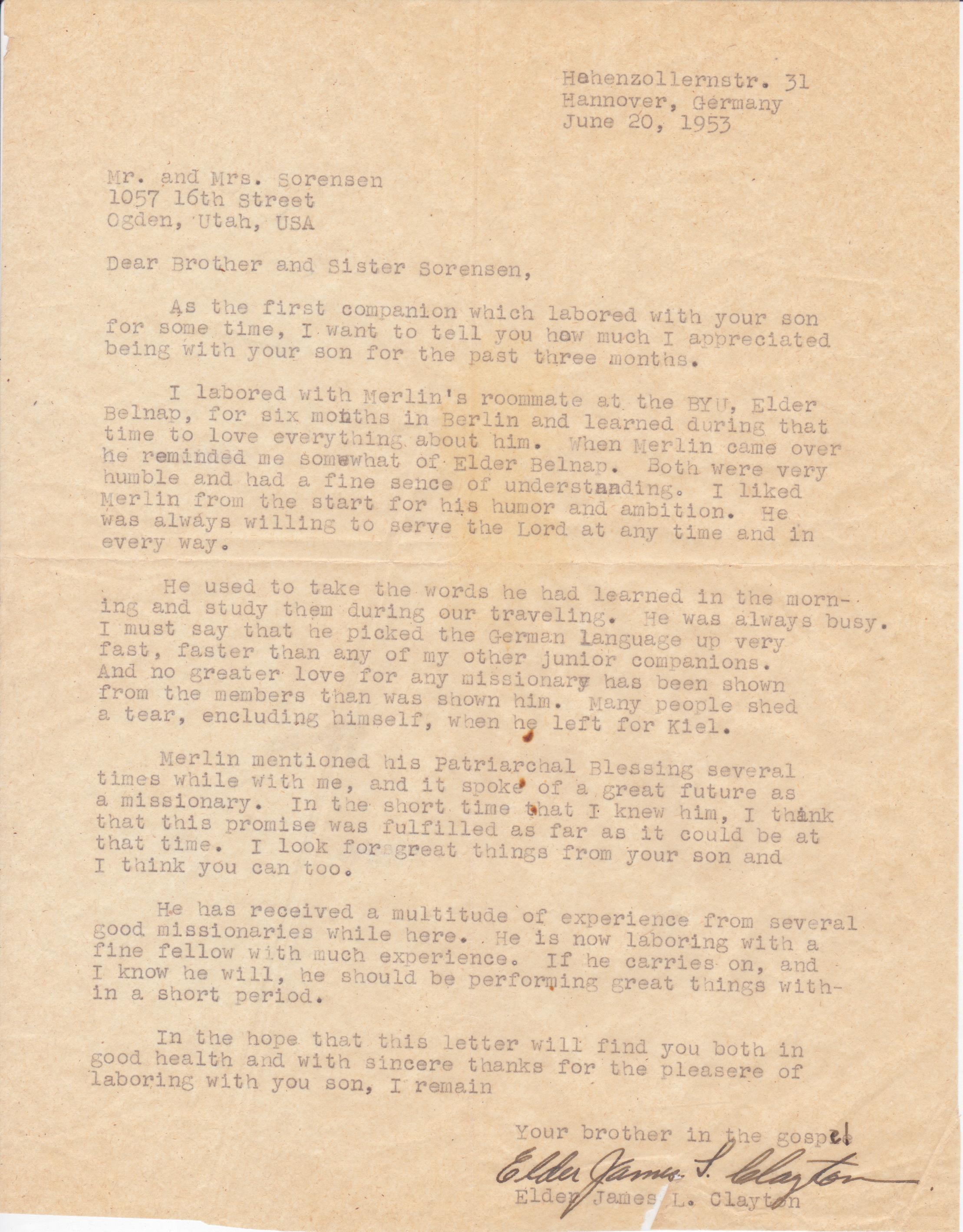 I asked to be left in Hannover until I learned the language a little better so I am now back in Hannover with Elder Clayton. He is really a wonderful missionary and I hope I can give the lessons as well as he does.